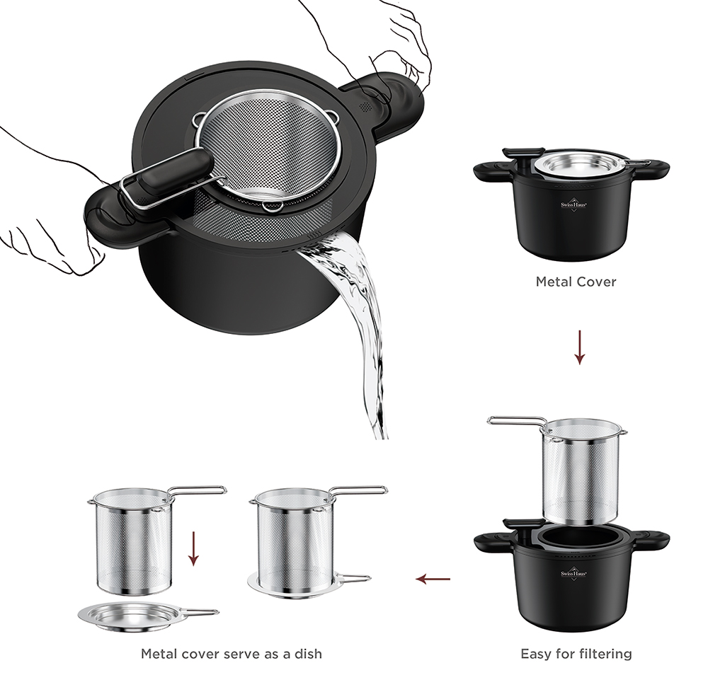 Take out the colander, and the pot can be used alone as a soup pot or stew pot. The colander can also be used for blanching ingredients or cooking grains. It meets all kinds of daily cooking needs, making this single pot work as a cooker, strainer and stew pot all in one.